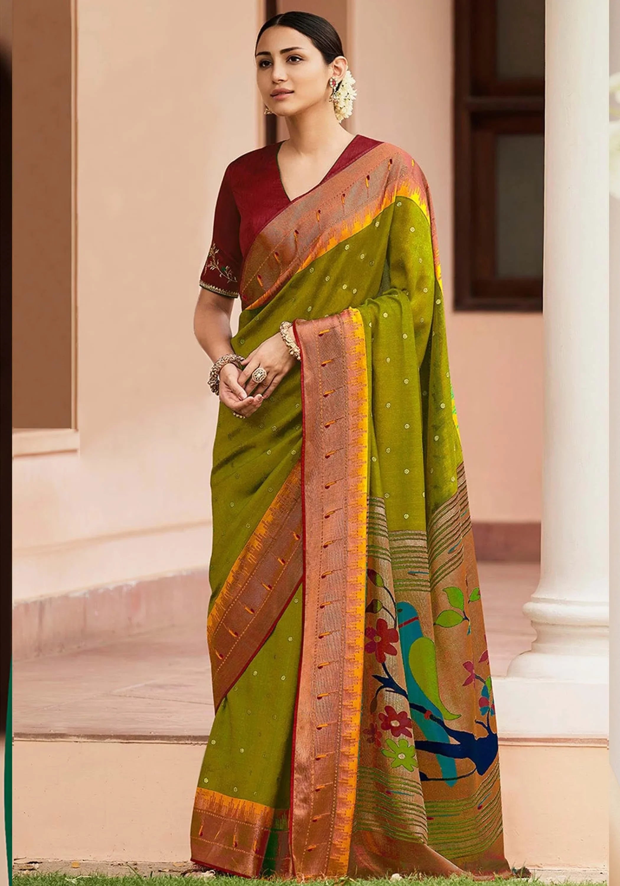 फ़र्न ग्रीन बनारसी सिल्क पैठानी बुनाई साड़ी