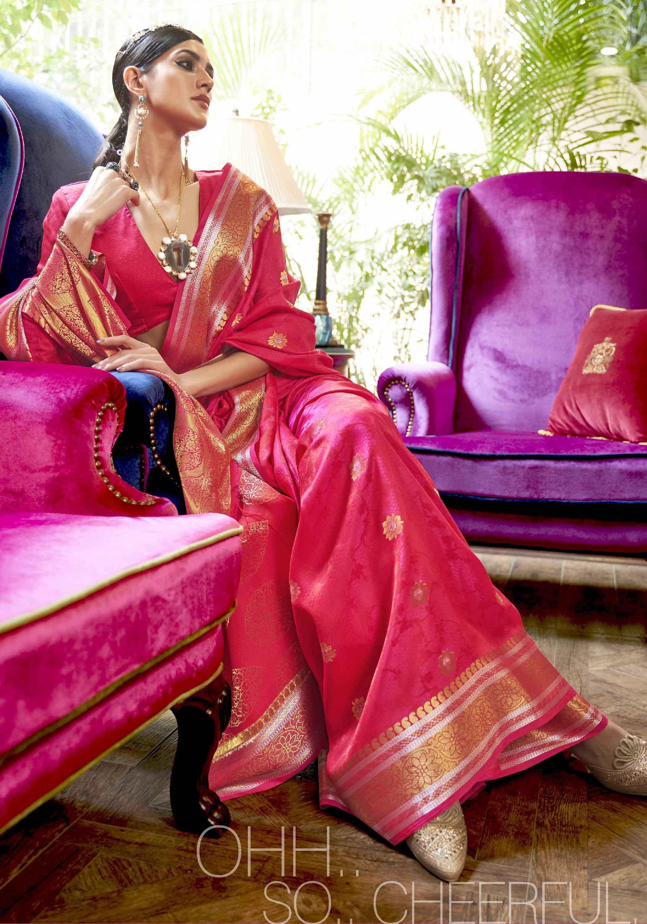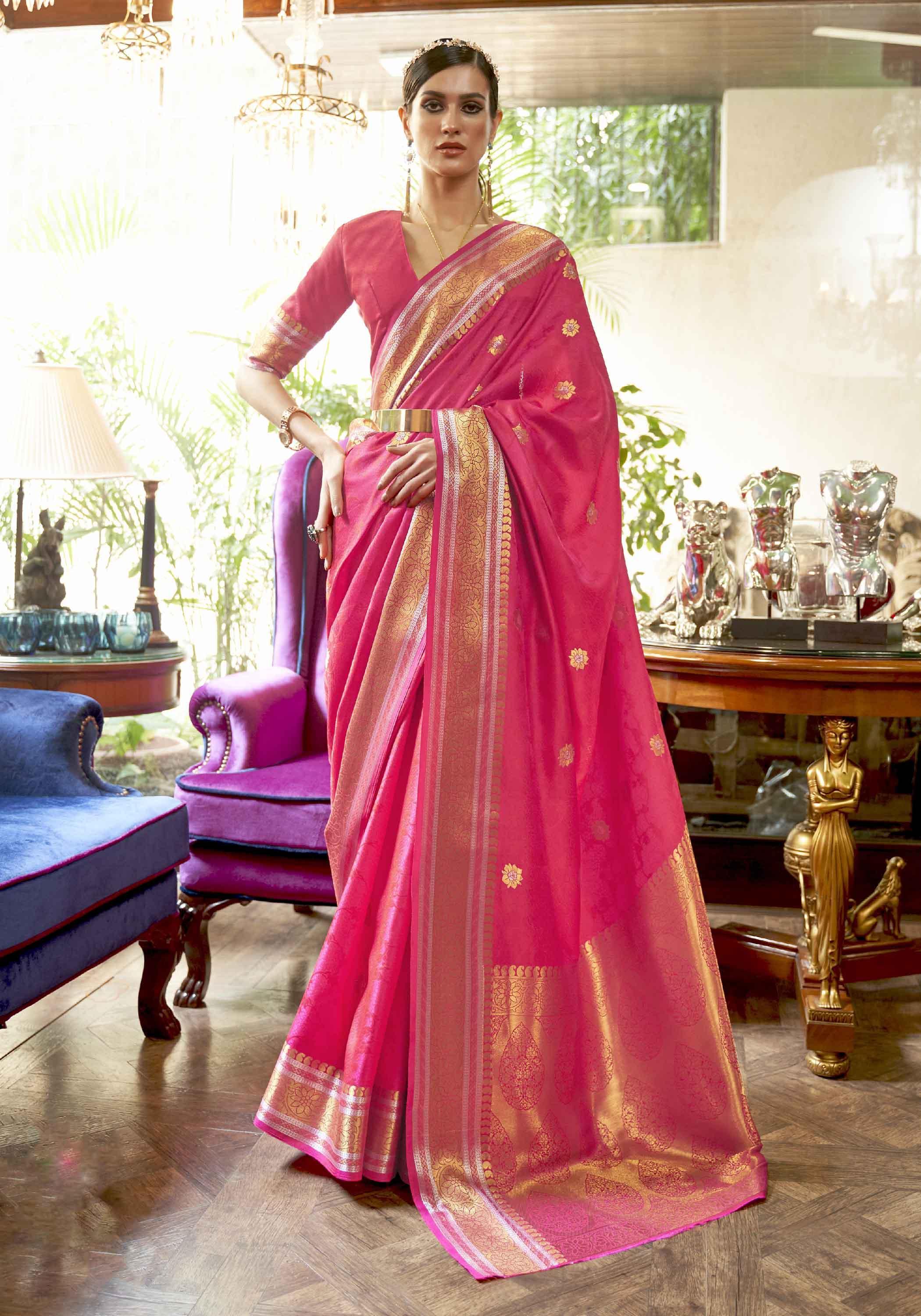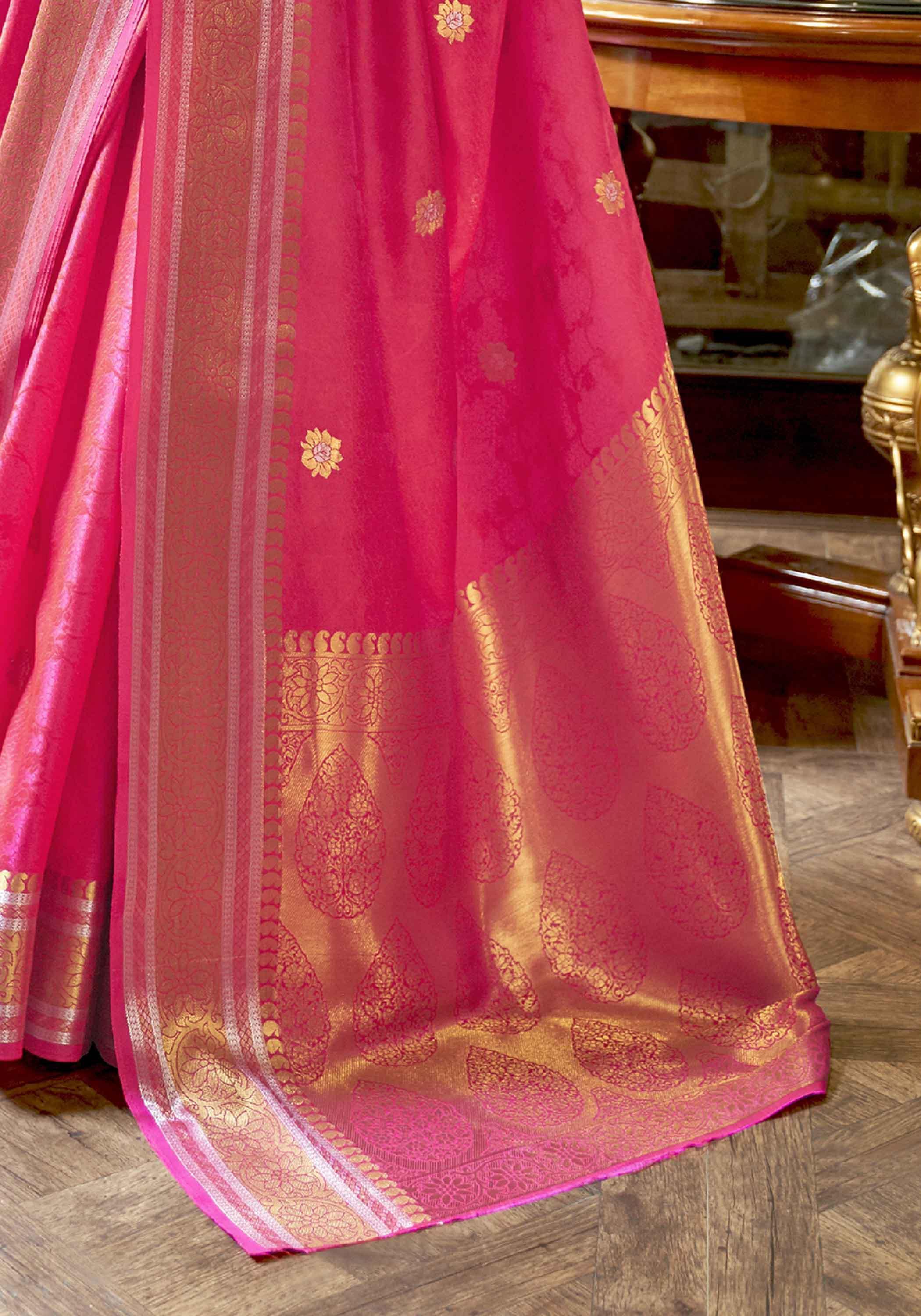 गर्म गुलाबी बुनी हुई कांजीवरम सिल्क साड़ी
