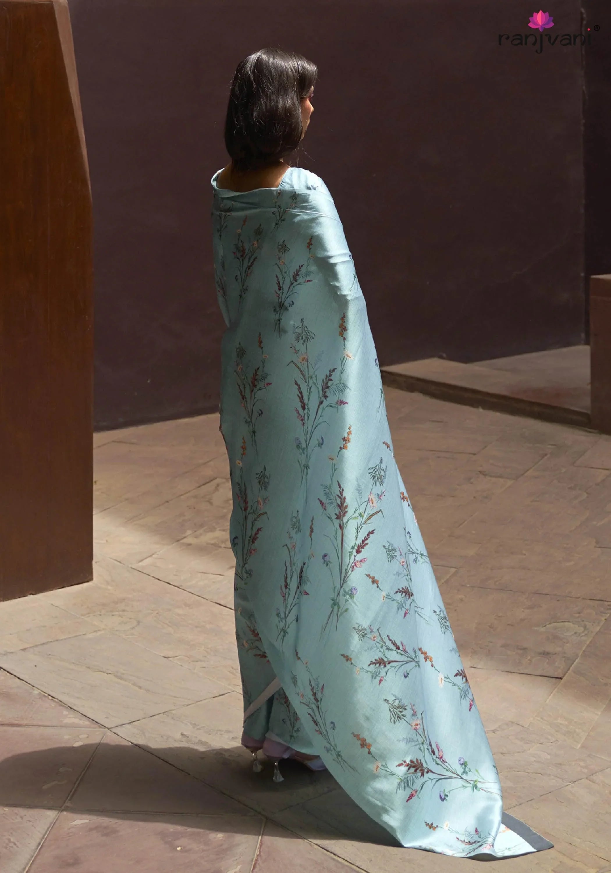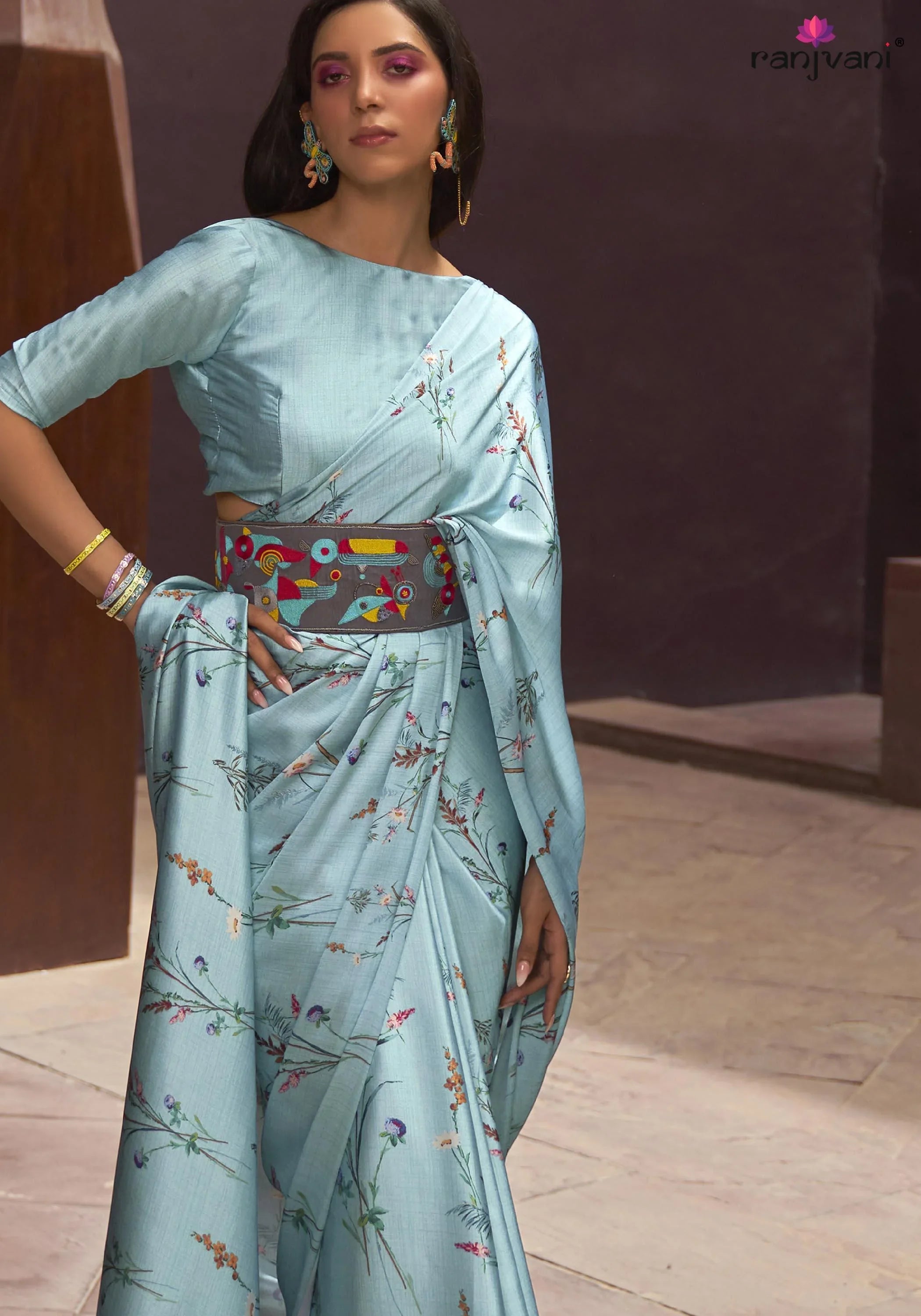 हल्की नीली साटन क्रेप सिल्क डिजिटल प्रिंटेड साड़ी