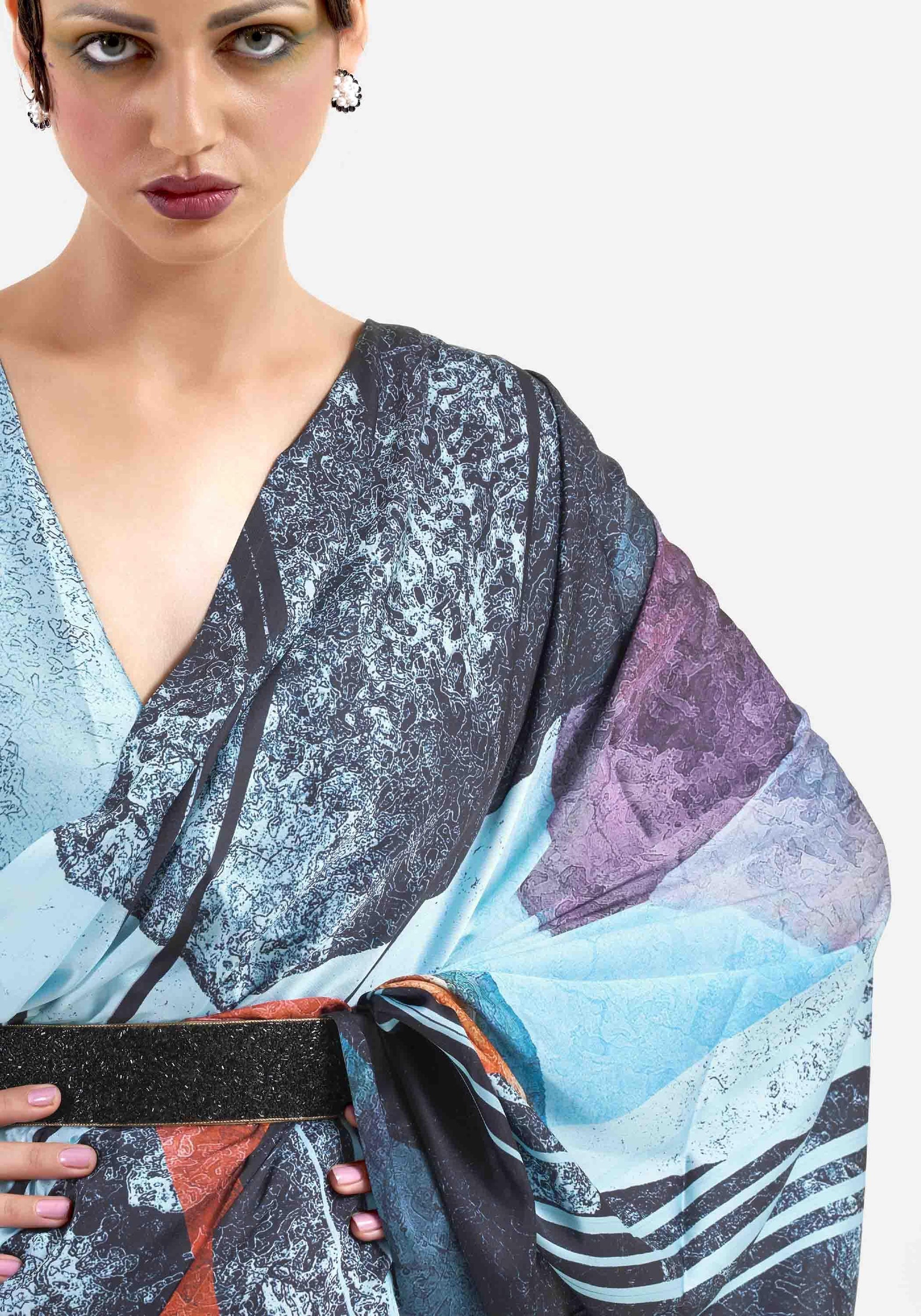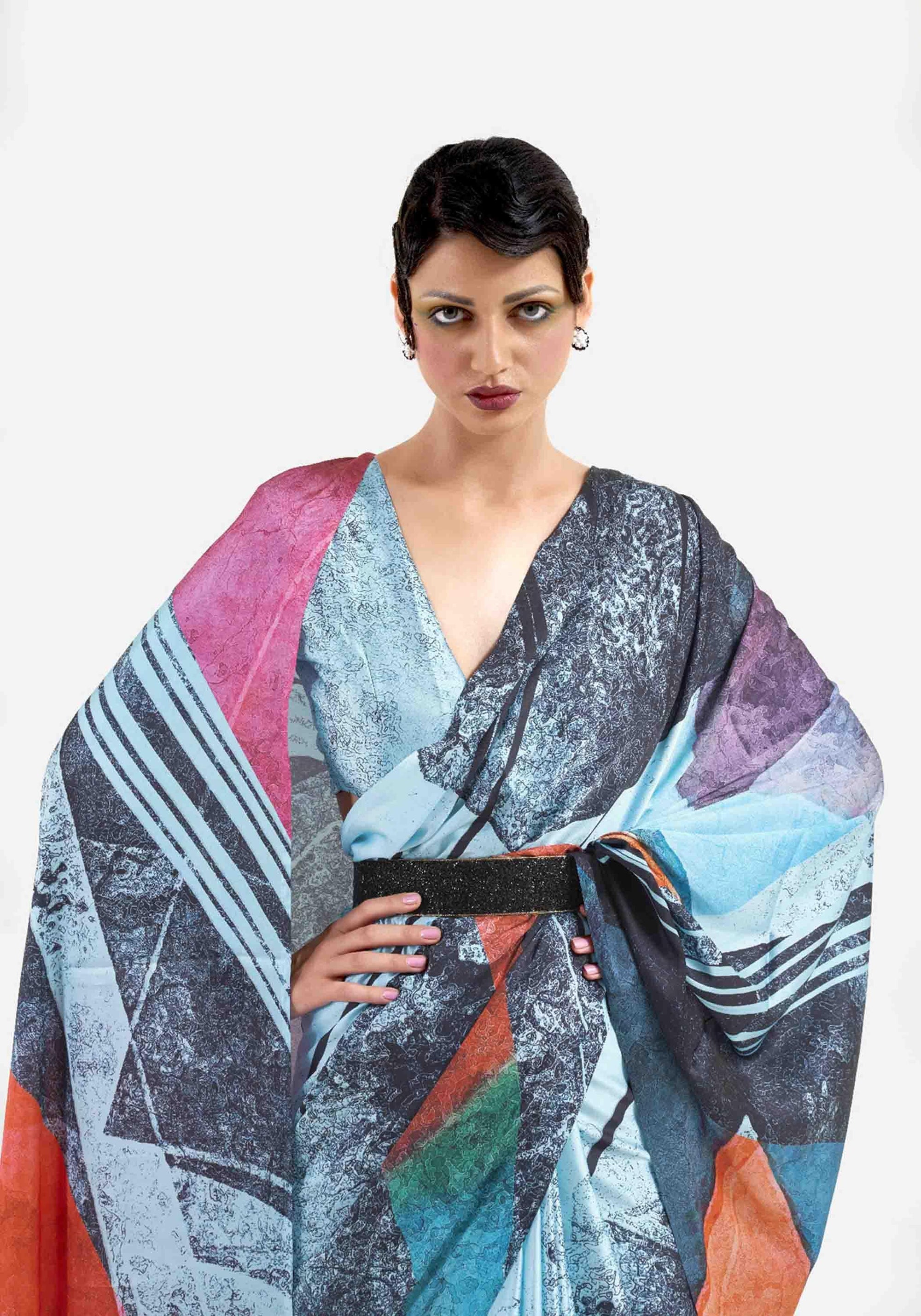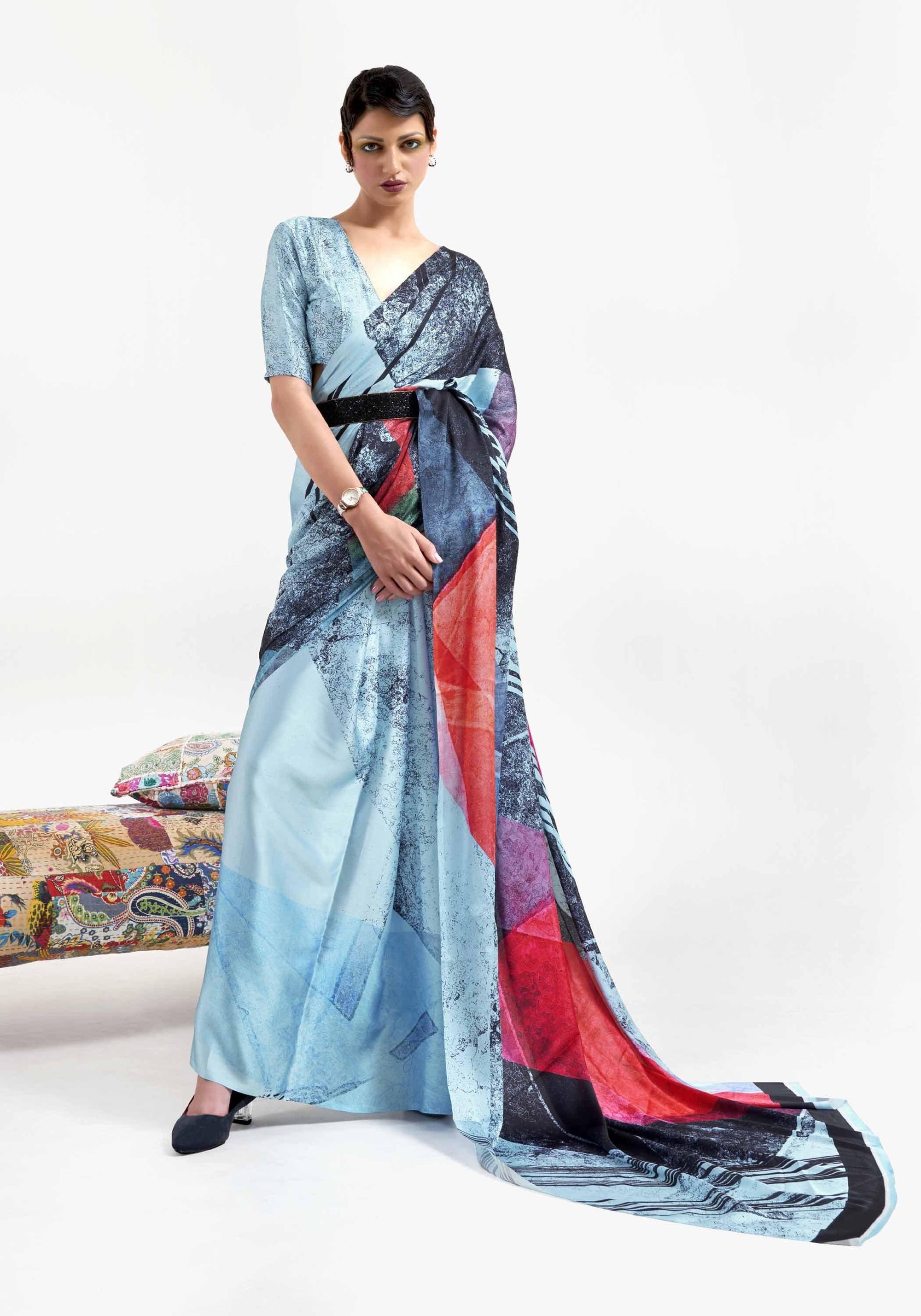 स्काई ब्लू साटन क्रेप सिल्क डिजिटल मुद्रित साड़ी