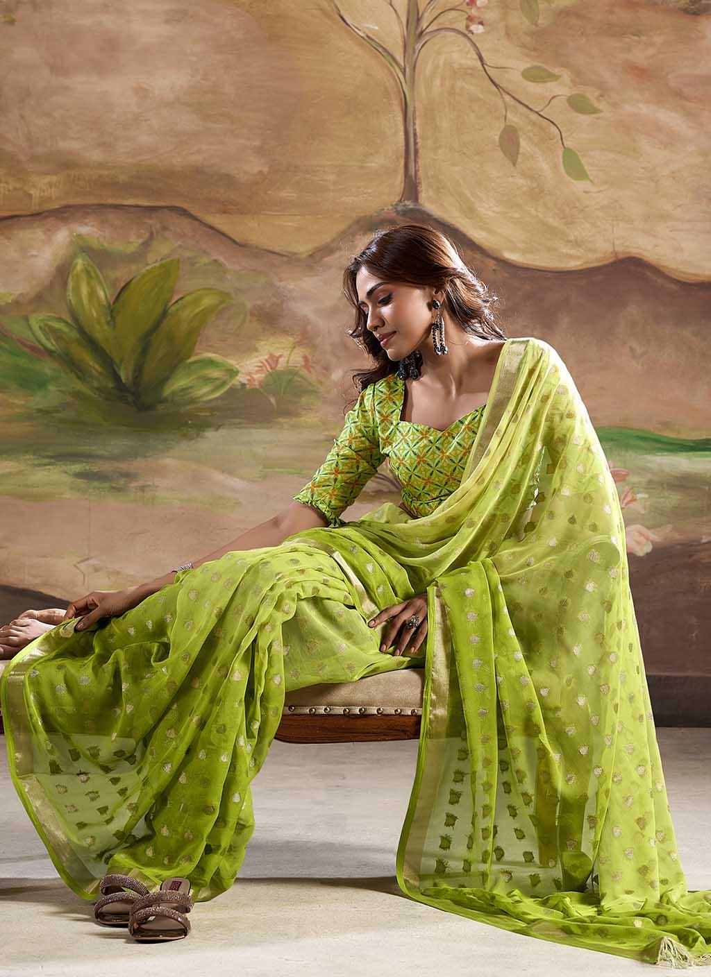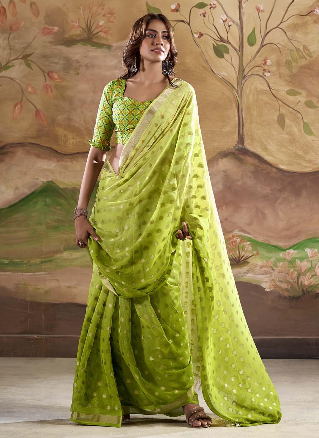 Fabric :- Georgette Silk With All Over Zari Weave Butties & Border.