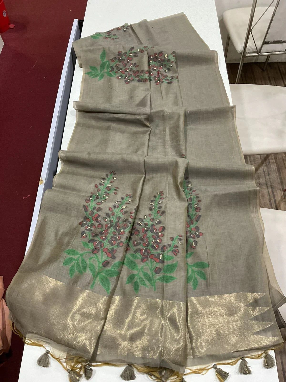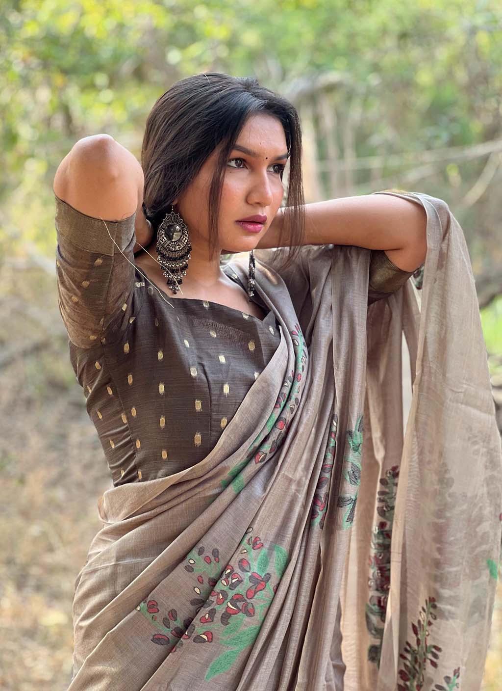 Fabric :- Premium Soft Cotton saree with all over unique floral weaving pattern with small zari patta on pallu with classic tassels