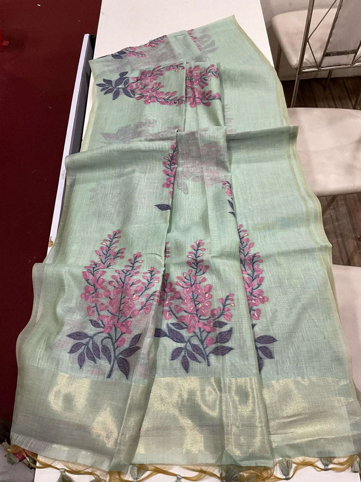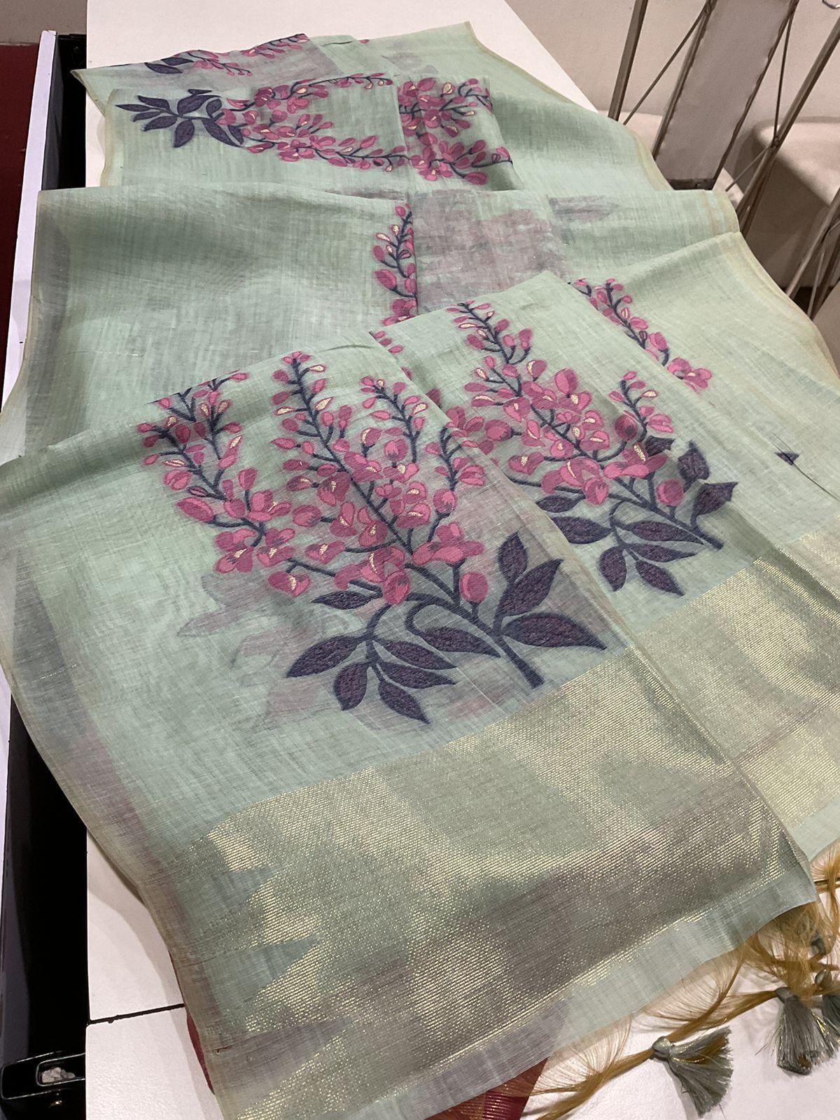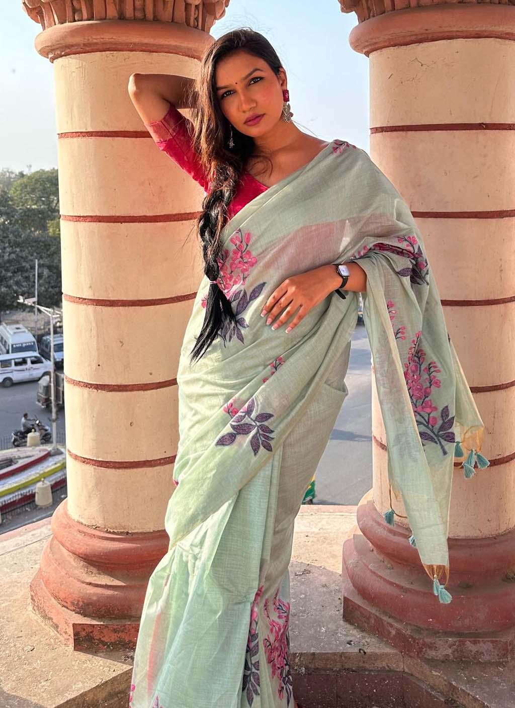 Fabric :- Premium Soft Cotton saree with all over unique floral weaving pattern with small zari patta on pallu with classic tassels
